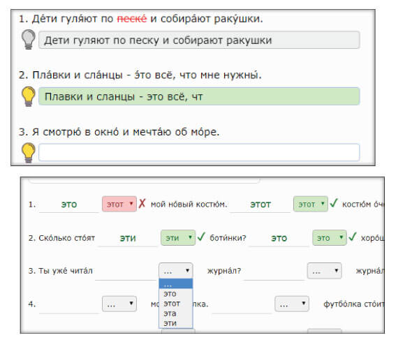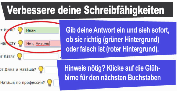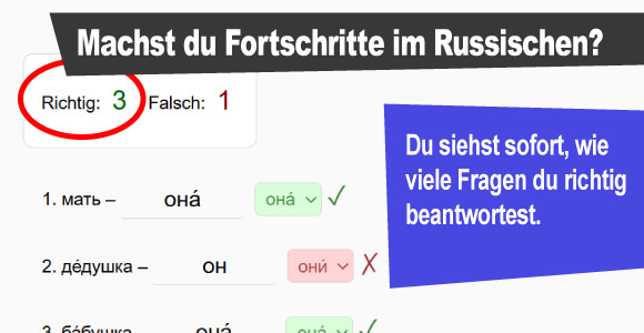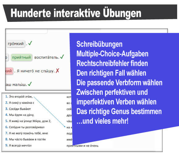 Lernen soll Spaß machen. Darum findest du in unserem Kurs tausende interaktive Übungsaufgaben, mit denen du dein Russisch mühelos verbesserst. Verstehst du eine Übung nicht? Keine Sorge, über den Übungen findest du ein Video, in dem die Lehrerin jede Frage samt Lösung erklärt.